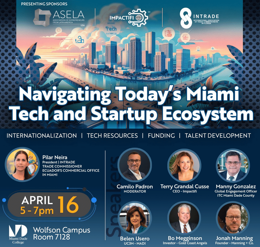 IMPACTFI kicked off its first internationalization event of the year at Miami Tech Week in Miami, “Navigating Today’s Miami Tech and Startup Ecosystem” at Miami Dade College. Our Chief Global Officer Camilo Padron moderated a great panel that included our CEO Terry Grandal Cusse.
